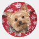 Yorkie, o Yorkshire terrier, perro ha estado jugando en el envoltorio de regalos de las vacaciones y disfrutando a fondo de sí mismo lindo Navidades pegatina de vacaciones