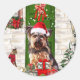 Navidades Yorkie Dog sentados afuera de la casa decorada con flores de flores de Navidad, el árbol de Navidad es una idea de regalo perfecta para Navidades amantes del perro.