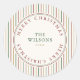 Crea tus propias etiquetas de Navidad con el nombre de la familia y la fecha en el fondo de rayas de color de vacaciones de estilo vintage.