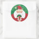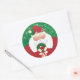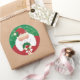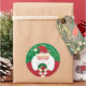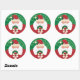 Esta pegatina de Navidad muestra a un alegre Papá Noel sosteniendo una corona con arco rojo y un ratón durmiente, latas de dulces rayados verdes y rojos y una salsa festiva con bayas escondidas en su gorra. Personalice su mensaje o utilice el que se proporciona, "Ho, Ho, Ho. ... ... ¡Feliz Navidad!" Diseñado por la artista Susan M Coffey.