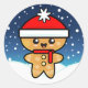 Navidades kawaii con panes de jengibre y un gorra rojo y blanco y una bufanda roja. Tiene dos botones amarillos, helado blanco y una cara feliz. Está parado en la nieve en una fría noche de invierno con copos de nieve cayendo a su alrededor.
