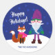 Pegatina Redonda Navidades Gnome Fox Snowflakes Midnight Blue