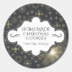 Elegante, negro y dorado de la cocina de vacaciones etiquetas de horneado - Negro con aspecto metálico dorado fondo de copos de nieve. En el centro hay un elegante emblema con bordes de carbón y curliceos. Lee "Cocinas de Navidades caseros" con letras elegantes, que pueden cambiarse a cualquier producto horneado o comida que sea su especialidad de vacaciones. Nombre personalizado debajo. Haga clic en la opción Personalizar para cambiar los colores del texto, el tamaño y los estilos de fuente. Etiquetas de Navidades de oro festivo para regalos de comida de vacaciones como receta en un frasco, venta de pasteles de vacaciones, fiesta de intercambio de galletas y otras festividades de temporada de vacaciones. No sólo para Navidades, sino también para pegatinas de invierno que preparan el tema durante toda la temporada invernal.