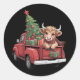 Pegatina Redonda Navidades vacacionan vaca en granja de camiones en