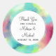 Boda gracias pegatinas con un diseño abstracto fresco y elegante. Las acuarelas se mezclan y se mezclan para crear la ilusión de una imagen espacial. Verde con remolinos de color violeta, amarillo y rojo claro se mezclan con un toque de puntos blancos y estrellas. Una elegante creación artística. Un círculo blanco se cubrió por encima con el texto dentro.
