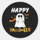 Pegatina Redonda Negro y Naranja con Fantasma Feliz Halloween