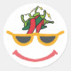 El diseño neuropicante presenta una sonrisa, un par de tonos y un cerebro hecho de chile pippers disparando mensajes entre los tallos. ¡Eso es picante! No hay necesidad de etiquetas.