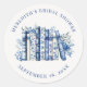 A sweet round sticker for a baby or bridal shower themed around “A New Chapter Begins.” The design features a simple serif font placed around the edge for a clean, timeless look. In the center, a watercolor stack of blue and white books is accented with delicate blue chinoiserie and French toile-inspired floral patterns, along with coordinating blue and white flowers, creating a refined, classic, and elegant feel that ties into the welcome sign design.