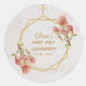 Un diseño floral geométrico de niña para primera comunión, con dos hexágonos metálicos dorados superpuestos sobre un fondo de mármol blanco con ramas de magnolia con flores rosas arriba a la derecha y abajo a la izquierda sobre el marco dorado irregular, que tiene una cruz dorada en la parte superior.