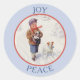 Una imagen antigua de un niño pequeño sosteniendo un cachorro en un paisaje nevado es la característica de esta pegatina de Navidad. Junto al niño hay un bulldog marrón y blanco en la nieve. La imagen está enmarcada en rojo delgado y colocada sobre un borde azul pálido que dice "ALEGRÍA" y "PAZ" en azul más oscuro. El texto es personalizable, así que puede cambiarlo si lo desea. Esta pegatina da un aspecto retro maravilloso a su correspondencia de vacaciones.