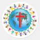 Ilustracion lindo de un grupo diverso de niños y chicas tomados de la mano alrededor de un globo del mundo y una cruz roja que representa la fe en Cristo. Fácilmente personalizar y elige tu propio color de fondo. Imagen disponible en varios regalos y productos.