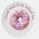 Un donut espolvoreado de azúcar se sienta en un plato blanco con las palabras "Yo no hago lo que haría sin ti".
