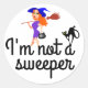 Imagen de una bella bruja con una escoba sobre su hombro, un gato negro con la espalda elevada y un texto que no soy un barrendero. Divertido pegatina redonda para Ella. ¡Personalizable. Puede cambiar dos imágenes y puede cambiar o eliminar dos textos de plantilla de forma independiente. ¡Diviértete! Las imágenes son tomadas de openclipart_org y son gratuitas para uso comercial.
