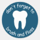 Estos pegatinas muestran un diente sobre un fondo azul oscuro y el texto, "no olviden cepillarse y flotar". Este es un gran artículo para repartir a los pacientes, especialmente a los niños que necesitan un recordatorio adicional para cepillarse y cortarse los dientes.