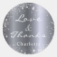 Un fondo con aspecto de plata falsa. Decorado con polvo de purpurina falsa. Personaliza y añade tu nombre. Con el texto: Amor y Gracias.