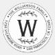 Elegantes y sencillas pegatinas redondas de monograma de nombre de familia con dirección de devolución que presentan su nombre y dirección en tipografía moderna y elegante sobre fondo blanco con un toque elegante de follaje rústico. Simplemente agregue sus datos a la etiqueta. Diseñado exclusivamente para usted por Happy Dolphin Studio. Si necesita ayuda o productos coincidentes, por favor contáctenos en happydolphinstudio@outlook.com.