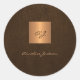 Etiquetas adhesivas redondas de lujo con monograma sobre fondo de cuero marrón oscuro y un cuadrado metálico de cobre dorado falso con iniciales de monograma en escritura. ++++++++++++++ Fáciles de personalizar con las iniciales de monograma de tu negocio o personales y nombre. ++++++++++++++ Pueden ser una etiqueta de regalo personalizada elegante para negocios o cualquier otra ocasión, papel de carta personal u oficina, sello de sobre.