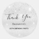 Un pegatina para una fiesta de cumpleaños número 50 (o de cualquier edad) glamurosa y femenina. Un falso fondo metálico plateado con un elegante polvo falso purpurina. El texto: Gracias está escrito con un gran guión moderno de estilo escrito a mano. Personalice y agregue un nombre y una edad de 50 años.