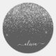 Pegatina Redonda Nombre monograma brillo destello lujo gris platead