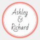 Nombres simples y elegantes que viven el coral y el boda blanco Pegatina redondo clásico. Muestra tus nombres en blanco con un borde de coral. Coordina con nuestra colección de bodas "hojas tropicales de coral vivos".