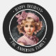 Pegatina Redonda Nostálgico negro Feliz feriado con chica en rosa