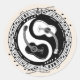 Un símbolo Yin Yang con guitarras acústicas, rodeado de notación circular (¿un rondo?). Arte blanco y negro, en camisetas, botones, pegatinas, regalos.