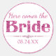 Estas etiquetas de pegatinas glamurosas tienen un tema de soltera, novia. La frase "Aquí viene la novia" está impresa en el centro, con "Novia" impresa en una fuente de purpurina rosa intenso. Una banda lujosa de diamantes está impresa debajo. Una fecha de boda de muestra está impresa en la parte inferior que puede personalizar para incluir su propia fecha u otro texto personalizado.