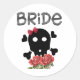 Diseño de novias esqueléticas de Guay para novias de cadera, novias góticas o novias de Halloween. Este cráneo tiene un arco rojo y flores rojas y la palabra novia en blanco y negro.