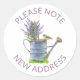Alerta Rustic New Address - excelente para sellos para sobres o como pegatinas de su correspondencia para llamar la atención sobre su cambio de dirección. La acuarela está decorada con una hermosa y acogedora lata de agua con flores de lavanda, una mariposa y un pequeño y querido ataúd dorado. La tipografía capitalizada es azul y dice "POR FAVOR, NOTEN NUEVA DIRECCIÓN". Hermoso ilustracion rústico. Por favor, navegue por nuestra colección de direcciones nuevas para coordinar los suministros de correo.