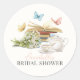 Esta elegante etiqueta de despedida de soltera con el mensaje "un nuevo capítulo comenzará pronto" presenta un fondo crema con pilas de libros, mariposas, un ramo de flores, tetera y taza de té en acuarela. Personalízala según tus necesidades. Puedes encontrar productos que combinan en mi tienda.
