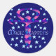 Un símbolo en tonos de lila, violeta, púrpura y magenta forma la forma familiar usada para describir diosas y brujas con estrellas azules y las palabras "la magia ocurre".