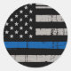 Delgado Pegatina de la Línea Azul - Bandera estadounidense con colores de la bandera de la policía, diseño angustiado . Este pegatina de policía es perfecto para enviar sobres, empaquetar regalos para fiestas de graduación o jubilaciones y departamentos de policía. DERECHOS RESERVADOS © 2020 Judy Burrows, Black Dog Art - Todos los derechos reservados. Pegatina redondo clásico del oficial de policía de la línea azul delgada