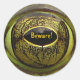 Este temible pegatina de Halloween muestra el cierre de un ojo de rana verde. Su iris es un increíble patrón abstracto de oro y amarillo. El puro alumno oval negro del centro refleja los árboles a lo lejos. El texto dice: ¡Cuidado! Se puede personalizar o quitar.