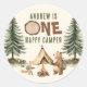 Celebrate your little adventurer with this One Happy Camper stickers. Featuring a charming woodland camping theme with trees, tent, campfire, and forest animals, this design is perfect for a boy’s 1st birthday party. Place on birthday party favors, treats, gifts, envelopes, take home bags and more! Ideal for rustic, outdoor, or camping-themed birthday celebrations.