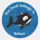 Cute orcas blancas y negras / ballena asesina en un pegatina de placa de libro azul purpurinoso. Personaliza con tu propio texto. El texto, el tipo de letra, el tamaño del tipo de letra, el color y la posición son completamente personalizables, así que hágalo el suyo propio. La apariencia dimensional en este pegatina se simula en la obra de arte.