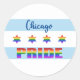Este diseño Chicago PRIDE combina los elementos de la bandera de Chicago con los colores del arco iris de LBGTQ. La palabra Chicago está en una fuente tipo script azul. Las cuatro estrellas y la palabra "ORGULLO" están en los colores del arcoiris.