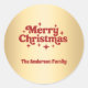 Un fondo falso de aspecto dorado, texto rojo. Feliz Navidad se escribe con un tipo de letra retro de los años 70. Personaliza y agrega un año y tu apellido.