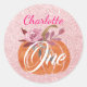 Pegatina redondo clásico de otoño con un gran calabaza floral naranja y un purpurina de oro rosa rosa rosado brillante fondo. La palabra "One" está en un guión grande y elegante en blanco, y su nombre personalizado está en un guión rosado en bonito. Puede añadir fácilmente el nombre de su elección y cambiar el color y el tipo de letra utilizando la opción personalizar.