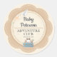 A cute co-ed baby shower invitation companion sticker, with a travel and adventure theme, featuring a scalloped frame with cute characters and travel related elements, with the title Baby Adventure Club. Perfect for future parents who love to travel, who love the adventure theme for a baby shower.