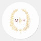 Hand drawing oval leaves wreath wedding event stickers in gold effect on white with dark maroon red text. Personalize with your own monogram initials. Ideal for sealing favors. Other matching items are available. Original art by Sarah Trett exclusively for www.mylittleedenweddings.com on Zazzle.