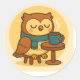 A glossy, vibrant round sticker featuring a charming owl enjoying a steaming cup of coffee at a cozy café table. With bold outlines, warm colors, and a playful kawaii style, this design is perfect for journals, laptops, water bottles, planners, and anyone who loves cute animal art and coffee culture.