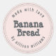 Pegatina de pan de plátano casero moderno con el texto hecho con amor, pan de plátano y su nombre en escritura y tipografía elegante en negro sobre un fondo rosa pastel. Simplemente agregue su nombre y el nombre del producto a la etiqueta. Diseñado exclusivamente para usted por Happy Dolphin Studio. Si necesita ayuda o productos coincidentes, por favor contáctenos a happydolphinstudio@outlook.com.