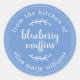 Galletas azules personalizables rústicas y modernas, pegatina de muffins de arándanos con el texto de la cocina de, muffins de arándanos y su nombre en elegante caligrafía manuscrita y tipografía moderna sobre un fondo azul de aciano. Simplemente personalice esta pegatina de regalo de repostería con su texto, el nombre del producto y su nombre. Diseñado exclusivamente para usted por Happy Dolphin Studio. Si necesita ayuda o productos coincidentes, por favor contáctenos en happydolphinstudio@outlook.com.
