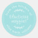 Galletas azules rústicas y modernas personalizables, pegatina de muffins de arándanos caseras con el texto de la cocina de, muffins de arándanos y su nombre en escritura moderna sobre un fondo azul turquesa. Simplemente personalice esta pegatina de regalo de repostería personalizada con su texto, el nombre del producto y su nombre. Diseñado exclusivamente para usted por Happy Dolphin Studio. Si necesita ayuda o productos coincidentes, por favor contáctenos en happydolphinstudio@outlook.com.