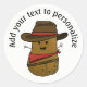 Una adorable y feliz papa marrón vestida con un gorra de vaquero, una bandana roja y un lazo en el cinturón. Encima de él hay una plantilla de texto curvada en texto negro para que personalizes a estos adorables pegatinas.
