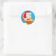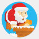 Esta imagen es un alegre pegatina vacacional que muestra a Santa Claus con su clásico traje rojo y gorra, saliendo alegremente de una chimenea de ladrillo con nieve en la parte superior. Su gran saco de regalos es visible detrás de él, y una bocanada de humo sale de la chimenea, capturando el momento mágico de la víspera de los Navidades. Un diseño festivo y lúdico perfecto para decoraciones de vacaciones, tarjetas o uso digital.