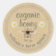 Etiquetas rústicas y simples de tarro de miel con una imprenta de abeja de miel vintage y el texto miel orgánica en caligrafía de escritura de moda y tu nombre de negocio en tipografía moderna sobre un fondo de papel kraft con un toque elegante de flores de margarita blanca y patrón de abeja hexagonal de oro. Simplemente agregue su nombre de colmenar, el nombre del producto y el peso a la etiqueta. Diseñado exclusivamente para apicultores por Happy Dolphin Studio. Si necesita ayuda o productos coincidentes, por favor contáctenos en happydolphinstudio@outlook.com.