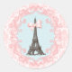 Este diseño está inspirado en París, ciudad de la moda y la luz. La famosa torre del eiffel, de estilo ilustracion vintage, está decorada con una cinta rosa claro que se coloca en la parte superior para darle un toque de circunferencia. El fondo está formado por puntos de polka azul claro y blanco y damasco rosa y blanco. Por último, está enmarcada por un marco de estilo vintage con remolinos rosas.