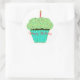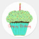 Pegatinas redondos con deliciosos quequitos de chocolate helado verde con rociadores coloridos y velas blancas rojas con una llama parpadeante colorida en un envoltorio de quequitos verde verde. Personaliza para CUALQUIER edad. Dejar la redacción tal como está, añadir su propio texto o borrar. Diseño original de obras de arte de TamiraZDesigns.