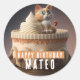 Pegatinas de cumpleaños con un pastel de cumpleaños gatito con "Cumpleaños feliz", letras en negrita y mayúsculas. Personalizar agregando tu(s) nombre(s).
